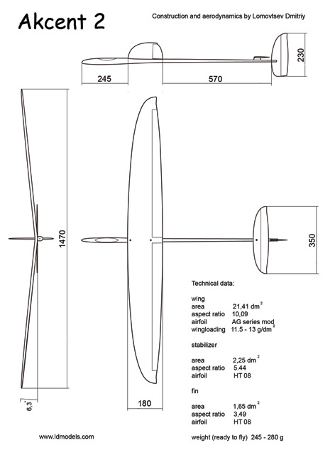 "Akcent-2" is a molded composite hand launch glider model made by Dmitriy Lomovtsev of LD-models in Russia. The model has several innovative features in addition to a sleek graceful design and a proven airfoil set (modified AG series from Mark Drela). The wing is molded with a CNC routed foam core inside a double layer fiberglass skin. A carbon grid ("disser") is layed under the skin for torsional stiffness. The foam core makes the wing very durable and repairable. The fuselage is a one-piece carbon molded affair with a 2.4G friendly fiberglass nose. The tail feathers are molded with CNC routed foam cores and a light layer of fiberglass. The stab is detachable and is mounted on a very clever and light tail mount with one plastic screw and two fixing pins. The model is designed for pull-spring control setup in the fuselage, but a pushrod setup can be used of course if desired. Pushrods, or strings and springs are not supplied with the kit and must be obtained separately by the builder. The glider is designed for pilots of any level - from beginners to advanced pilots. Akcent-2 has been successfully used by pilots in Russia and the first few models have been flown in the USA and Europe with positive feedback. Kit contents: