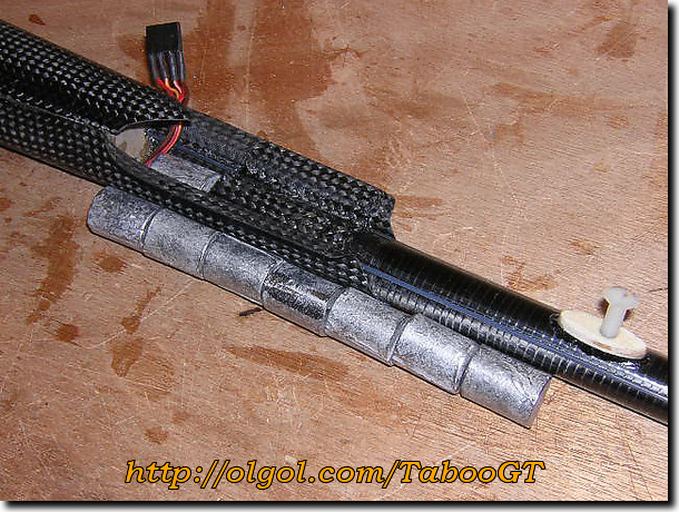 The maximum ballast capacity of Taboo GT is very high. It is possible to fit 7 slugs under the wing (185g, 6.5oz) which is quite a bit more than is needed for most conditions. You will receive 3 slugs with the kit if you purchase the ballast option. Mark the CG position on the fuselage after you test fly the plane and settle on your best CG location. The 3 slugs that will be the full ballast load must be centered around the CG.