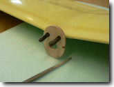 Cut and sand the small oval plywood platform from the supplied piece of light plywood. Drill a 1/8" hole in the middle of it. Scrape the shiny layer off the tailboom aaround the hole. |