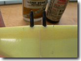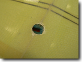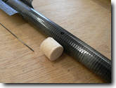 Drill a 1/8" hole through the tailboom. Insert the round balsa plug into the boom until it is approximiately centered around the hole. |