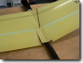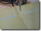Place the wing into the saddle, make sure it is as nearly square to the fuselage as possible. If you want to be really anal about it, use rubber bands to hold the wing down and measure the distance from the wing tips to the tailboom end. Use a drill bit to mark the location of the hole in the tailboom. |
