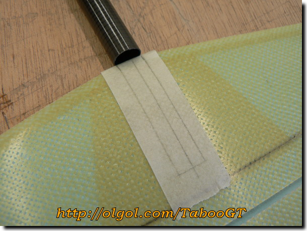 2. Cover the center of the vertical tail with masking tape. Mark the location of the cuts on the tape. Use the tailboom end to determine the exact distance between the cuts. The cutout must stop 5-8mm before the spar.