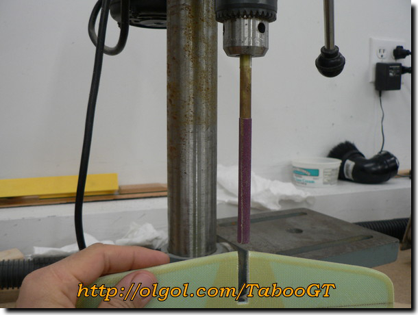 5. Either by hand or by using a drill press set to the lowest speed, make the shape the inside of the cutout cylindrical, and enlarge the cutout to fit snugly over the tailboom.