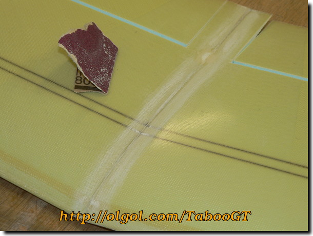 20. Rough up the surface around the joint. Sand it with 150 grit sandpaper on both sides of the wing. This will guaranatee a good bond of the fiberglass to the wing skin.