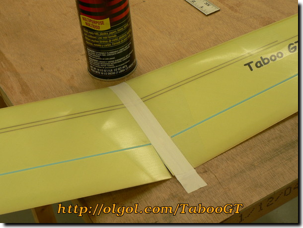 21. Spray the fiberglass strip with 3M77. Carefully place it over the joint. You may have to use pencil marks on the fiberglass strip and the joint line to make sure the the strip is exactly at the center of the wing.