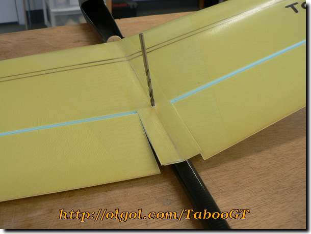 Place the wing into the saddle, make sure it is as nearly square to the fuselage as possible. If you want to be really perfect, use rubber bands to hold the wing down and measure the distance from the wing tips to the tailboom end. Use a drill bit to mark the location of the hole in the tailboom.