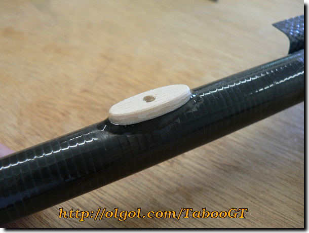 40. Use medium CA to attach the oval platform to the tailboom. Make sure the holes are lined up. Do not kick the CA if you want maximum glue strength.