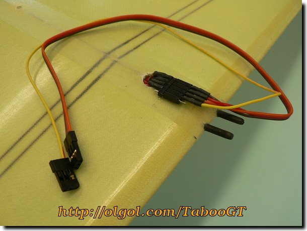49. Use two servo pigtails to make a wire harness. You only need the signal wire from the second pigtail. Antenna wire is soldered to the extra pin if you choose to install your antenna in the wing.