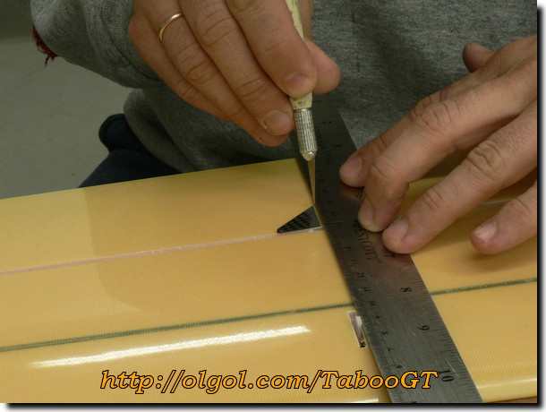 8. Mark and cut the slot for the control horn directly downstream from the servo arm.