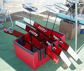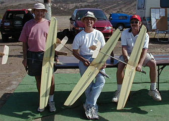 particular. ![]() A very strong showing was made by Photon models, manufactured and sold by Jerry Crainock using parts made in Ukraine. Photons seem to be very popular in California and performed very well at IHLGF. Jerry was near the top of the table throughout the contest and finished 11-th overall. The airplanes looked very nice with a bright shrink film covering and did not have any trouble finding thermals and skying out. ![]() Below is another example of artistic efforts of one of the pilots/builders. These models also looked very distinctive in the air and on the ground. The builder of these models, Norm Timbs, sent me the following info about the design: "Designers/builders: Thomas Akers & Norm Timbs. Name of Plane: Coriolis. Airfoils by John Asplund. We CNCed the mold for the Kevlar pod and used a carbon tailboom form Jerry Krainock. We bagged 1.0 oz Kevlar skins and prepreg spars over spyder foam. Six channels. We finished the models the day before the contest and I learned how to fly (sort of) on Friday. We are looking forward to next year." ![]() If you have never come to IHLGF and are even remotely interested in hand-launch gliders, you owe it to yourself to visit the next IHLGF in Poway. You will not regret it.