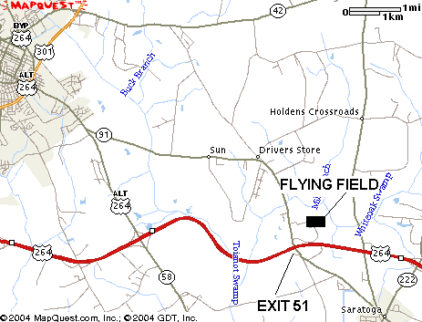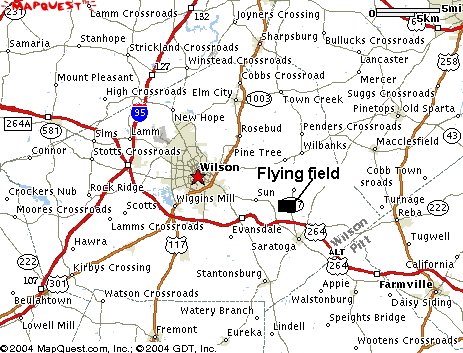 | ECHLGF Home Tasks ans Rules Map and Hotels Registered pilots Picture gallery Results ECHLGF 2003 archive | The field is located about 4-5 miles from Wilson, NC, at the intersection of hwy 264 BYP and Rt 91. NOTE: The section of Rt 91 between ALT 264 and 264 is marked as ALT 264 on the roads everywhere due to the previous construction and re-routing of 264! If coming from Raleigh (RDU airport) or from hwy I-95, take 264 bypass and go around Wilson from the south. Take exit 51 and turn left to cross over the highway 264. After crossing the highway bridge immediately turn right onto a gravel road that will take you to the flying field.   If coming from Wilson, follow 264 ALT about 2 miles to Rt 91, turn left onto Rt 91. NOTE: The section of Rt 91 between ALT 264 and 264 is marked as ALT 264 on the roads everywhere due to the previous construction and re-routing of 264! Follow Rt 91 for 2-3 miles, it will start up a rise to bridge over hwy 264. At that point there will be a left turn that goes to a gravel road. Follow the gravel road for 1/2 mile through the farm land to the field.   Wilson Area Motels: |