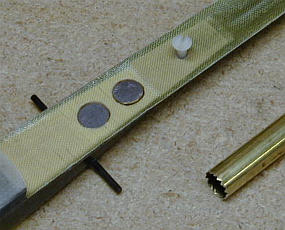 ![]() To turn the brass tube into a hole cutting tool, use a sharp file and make small teeth on one end of the tube as shown in the picture. Then carefully make 2 holes in the fuselage deck by turning the tube and pressing on it. Be carefull not to tear the balsa under the kevlar when making the holes.