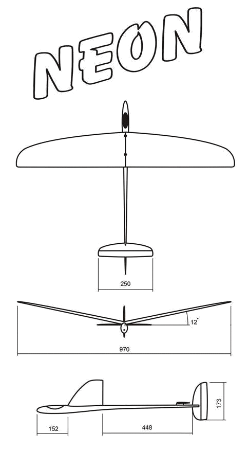 "Neon" is a typical representative of the one-meter "Mosquito" class of hand launch gliders. The glider is designed for pilots of any level - from beginners to advanced pilots. Gliders of this class proved to be a great F3K model in competitions held in Russia, and they are very popular among local pilots. Technical data Wing Area 12.8 sq.dm. Section AG mod Stabilizer Area 1.3 sq.dm. Section HT08 Elevator deflections +/-25...30 deg Fin Area 1 sq.dm. Section HT08 Rudder deflections +/-35...45 deg All up weight 170-190g Empty weight 120-130g Recommended CG 75-80mm from root LE Aerodynamics The main design criteria of this model - simplicity of control. The glider has shown to be an excellent model for beginners and even children. Beginners can concentrate on how to properly throw and control model, rather than on how to set up best flight modes. For ease of control, Neon has a pretty large dihedral angle of the wing. This makes the model very responsive and stable in any weather. Tail surfaces of Neon have a generous area. It makes it possible to smooth out some errors in control. Increased fin area helps to obtain straight launch. Neon is delivered with two control surfaces: elevator and rudder. This is more than enough for "Mosquito" class glider and does not limit in any way flying possibilities of Neon. The glider responds to the control inputs very well and feels comparable to gliders with ailerons. Neon can be used both for training and competition flights. Construction The design philosophy can be described by the phrase: "as simple as possible." Neon delivered in ARF condition: one-piece wing is completely ready for installation on the fuselage; pylon for stabilizer preformed with the fuselage; necessary mounting holes are prepared. You have to only install the fin and RC equipment. In addition to the simplicity of assembly Neon has a rigid and sturdy construction. Wing The wing is a monolithic structure, and has all the necessary reinforcements and the mounting holes. Wing is made of a foam core, covered with two layers of lightweight glass cloth in negative molds with high pressure. This technology provides a lightweight and very strong wings. Two layers of glass cloth priovide excellent protection of the wing from scratches, dents, and damage from grass, bushes during flights or transportation. Wingtips are reinforced around the throwing peg. Spar is made of carbon tow, making the wing sufficiently rigid and strong. Tail surfaces Construction of tail surfaces is very similar to the wing. Fin and stabilizer are made of foam core, milled on CNC and molded with glass cloth in negative molds. Large control surfaces ensure excellent handling of Neon. Fuselage Fuselage of Neon is made using some of the best practices in the construction of F3K models. It has no joining parts: nose, tail boom and pylon for stabilizer are molded in one piece. Such fuselage has great reliability together with high overall rigidity. The fuselage is molded of glass and carbon with usage of high pressure. Absence of joints increases the reliability of the fuselage and completely eliminates the possibility of separating a certain part of the fuselage due to poor gluing. This is a very frequent problem for inexperienced pilots and hobbyists. In addition to the reliability the fuselage is very convenient for RC gear installation. RC compartment of the fuselage is so large that it can fit any 9g servos, pretty large receiver and batteries of AAA size. When installing the stabilizer, one needs to make a groove in the backside of pylon for elevator horn, and glue horn exactly on symmetry axis of fuselage. Thus horn moves inside the pylon and does not produce additional drag. Kit contents: