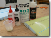 Fold the wing panels back to back, tape will hold the bottoms together. Mix some 10-15 minute epoxy with microfibers and/or microballoons to the consistency of a thick mayonaise. |