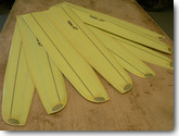 Set the servos aside and prepare the wing roots for joining the panels. Remove a thin layer of foam between the spars. This will create a vertical epoxy bridge between the top and bottom spar caps needed to prevent the caps from collapsing into the foam. Important - mark the location of the wire channels on the bottom of the panels. |