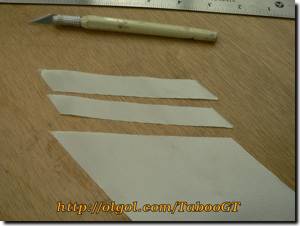 122. Prepare two strips of fiberglass cut on a bias (at 45 deg to the fibers) for reinforcing the vertical tail bottom.