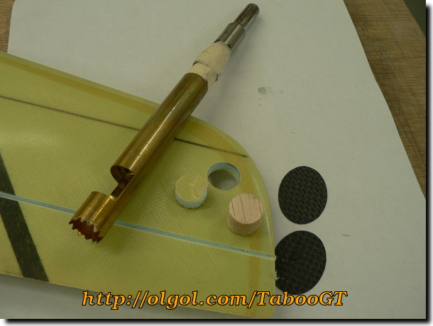 To create a hard point for the wing tip throwing peg, use X-acto knife or a toothed brass tube to cut a hole in the wing tip for the round balsa plug. Make two ovals from the suppliled pre-cured carbon patches.