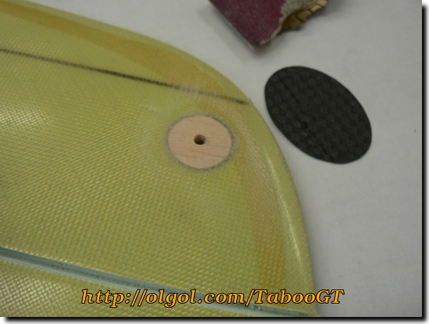 133. Glue one patch to the wing over the balsa plug. Drill a pilot hole through the middle of the balsa plug.