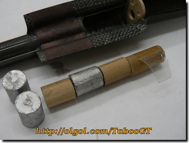 138. Make 2 blanks from a large dowel, and a longer front block for locking the ballast in place. A tab from clear tape helps to pull the front block out of the fuselge.
