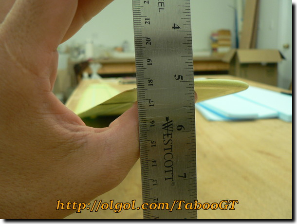 This is a good time to check the wing dihedral - 170-190mm from the table with one panel flat on the table. If a small correction is required, use a sanding block to adjust the bevel angle of the wing roots. Very little effort is needed to produce large changes at the wing tip, so be careful not to overcorrect.