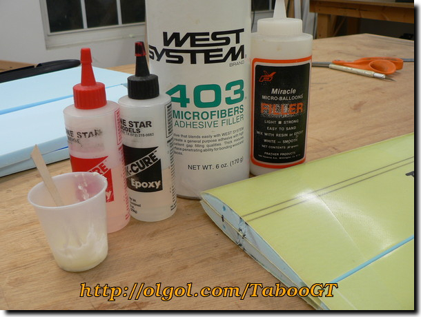 15. Fold the wing panels back to back, tape will hold the bottoms together. Mix some 10-15 minute epoxy with microfibers and/or microballoons to the consistency of a thick mayonaise.