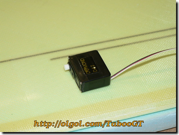 4. Start with cutting the servo pockets in the wings. Cut off the mounting lugs from both wing servos. Use previous step (3b) for proper positioning of the servo.
