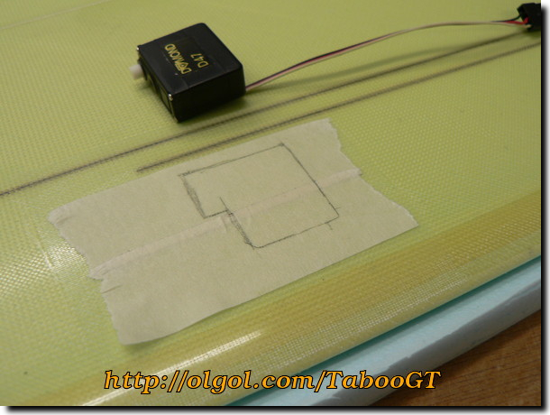 5. Apply masking tape to the skin where the servo pocket will be cut. Trace the servo outline with a pencil. Allow for some space for the servo arm.