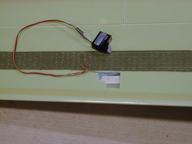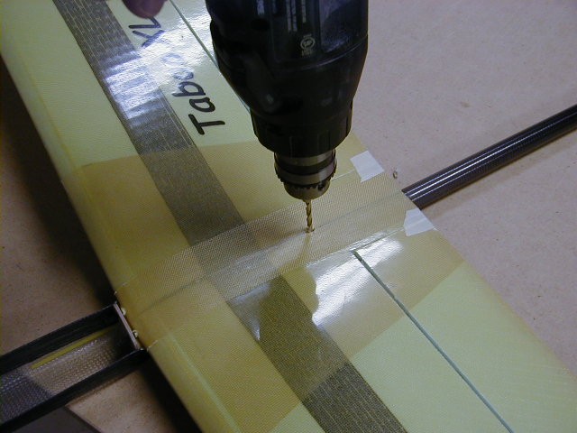 Tape the servos in the wells with a scotch tape. Drill the wing tip for the