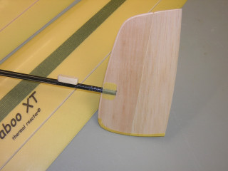 Next come the external pushrods that are becoming more and more a standard in the DLG world. Using thin walled tubes of bondable teflon as the pushrod guides allows Taboo XT to have straight, stiff pushrods which makes for a positive, "no slop" control system. This is especially important for the high speed discus launches when the speed of the model can reach extreme levels. Using external pushrods with light teflon tube guides not only improved the functionality of the control system but also allowed to save 1-2 grams of weight at the tail of the model. The saved tail weight was used to increase the size of the vertical tail.