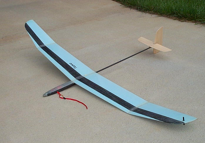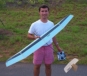 Shown here are the pictures of one of my competition planes that I used in Poway to take the 2nd place in the IHLGF and in Huntsville to take the 1st place at Mid-South championship. It is a standard production Taboo except for the detachable stab and control horns. I decided to get fancy with the control horns and used plastic horns made for slow flyers from Hobby-Lobby. In the kit I supply the spectra-carbon control horns that are already pre-made for you. All you have to do is insert them into the control surfaces and apply glue. Wing is blue foam, skin of fiberglass on a bias, carbon spars. The wing comes cut into panels, bevels pre sanded to the correct angle. All you have to do is butt glue the panels together and reinforce with supplied 3oz fiberglass strips. Then install the attachment carbon dowels and reinforce the center for the nylon bolt. Fuselage is molded of fiberglass and carbon. Requires no work other than drilling the hole for the wing bolt and tapping it. Fuselage comes with the pushrod guide tubes installed. Tails are made of contest grade balsa vacuum bagged with light fiberglass on a bias. Require no work to finish them, only mount the stab and attach the pushrods. The fin comes glued to the tailboom. Stab requires gluing to the balsa pylon and then gluing to the tailboom. Servos are glued to the fuselage bottom with epoxy and micro-balloons. Fuselage was designed to take 110mah nicads, Hitec 555 receiver and 2 HS-55 servos. A full size Hitec Super-Slim receiver fits with the case taken off, as you can see on the detail pictures. Airfoils are AG-04 transitioning to AG-08 at the tip. The airfoils work wonderfully - the plane thermals great and can be slowed down, while at the same time penetrates exceptionally well. The plane weighs about 9oz when finished. I usually practice with 1-1.5oz of ballast even in good weather to make me work harder and the plane pretty much does not suffer from the extra weight. Penetration is excellent with ballast. |